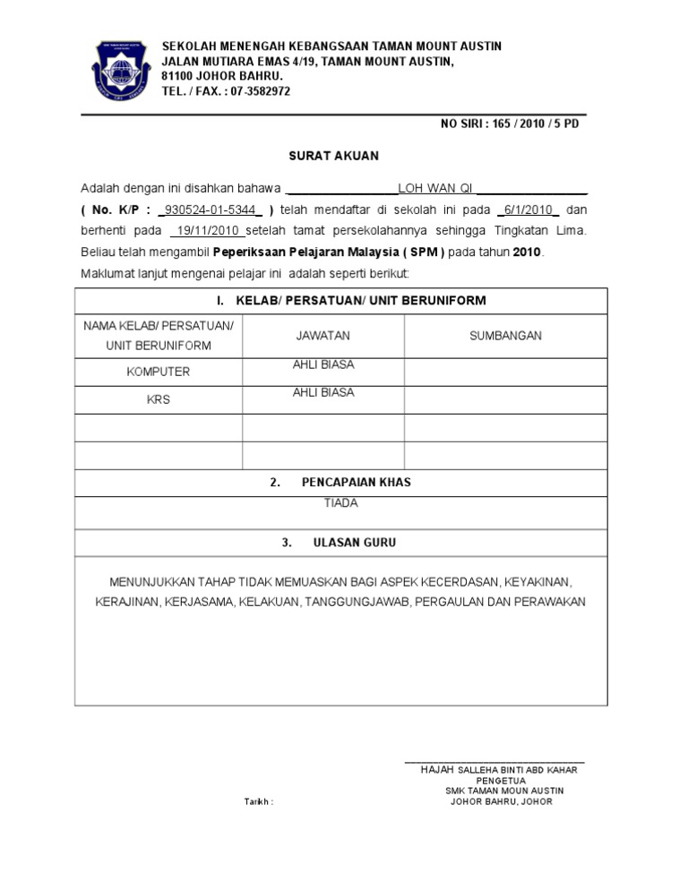 Surat Akuan Pelajar Tingkatan 5 Loh Wan Qi Pdf